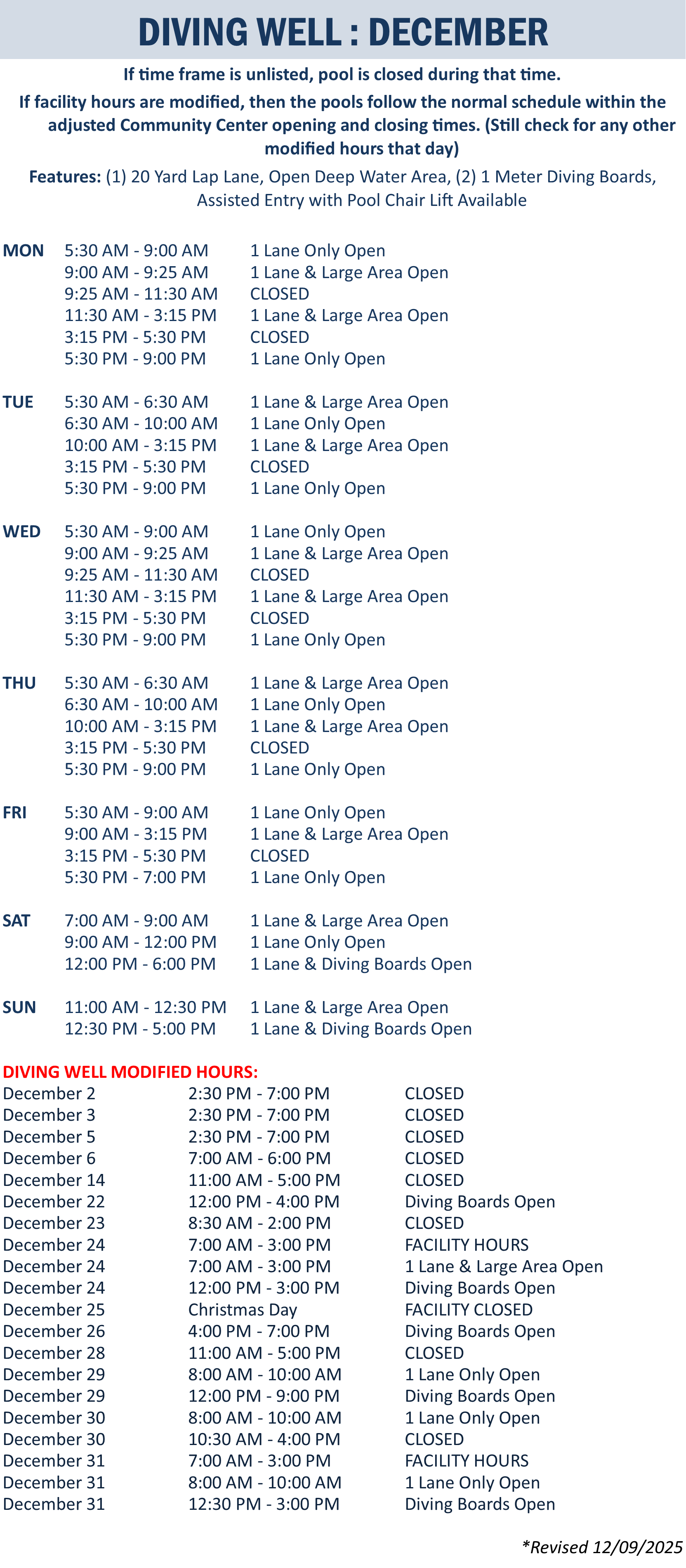 | Leisure Pool | December 1, 2025 - December 31, 2025 |