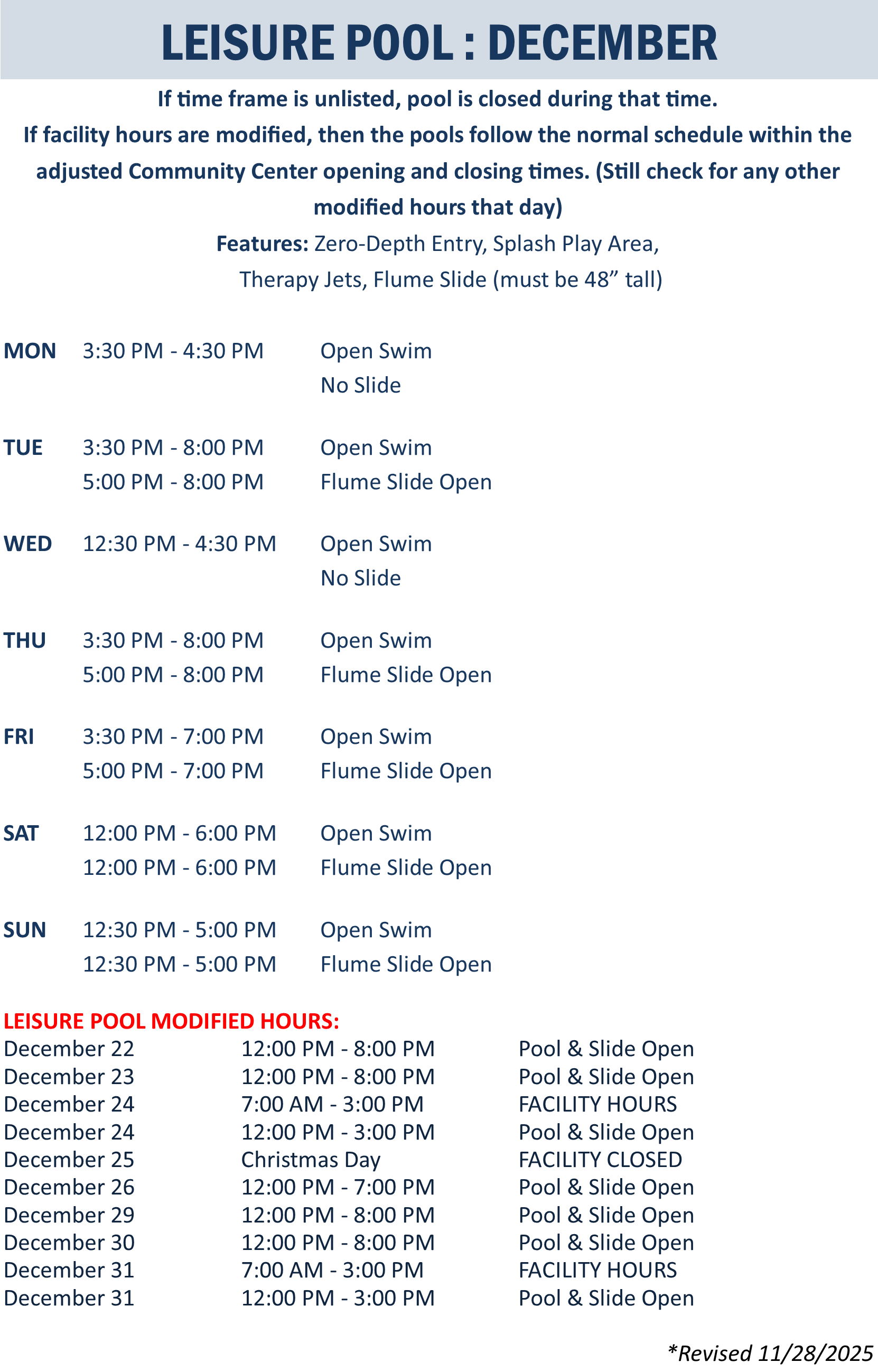 | Leisure Pool | December 1, 2025 - December 31, 2025 |