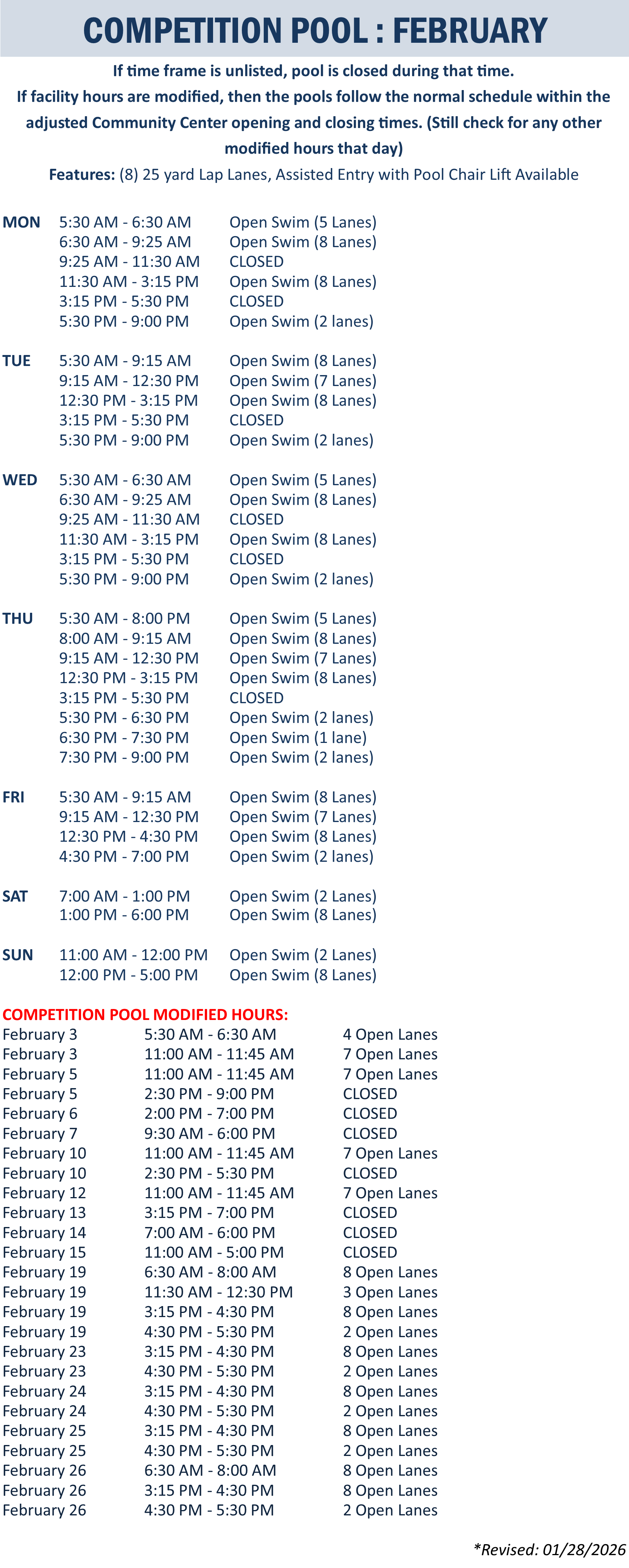 | Leisure Pool | February 1, 2026 - February 28, 2026 |
